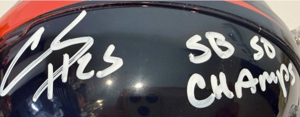 Celebrate the Denver Broncos' legendary Super Bowl 50 victory with this premium autographed mini helmet signed by cornerback Chris Harris Jr. This authentic collectible features Harris's signature along with the special inscription "SB 50 Champs," commemorating the Broncos' championship triumph over the Carolina Panthers.