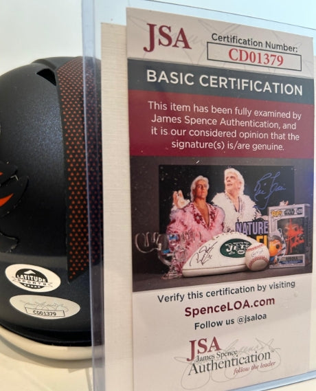 Authenticated by James Spence Authentication (JSA) with a Certificate of Authenticity, this piece offers verified provenance and investment-grade collectibility. The eye-catching Flash alternate design adds a bold, modern aesthetic that makes this helmet a standout display piece for any Broncos fan or collector tracking the next generation of Denver defensive excellence.