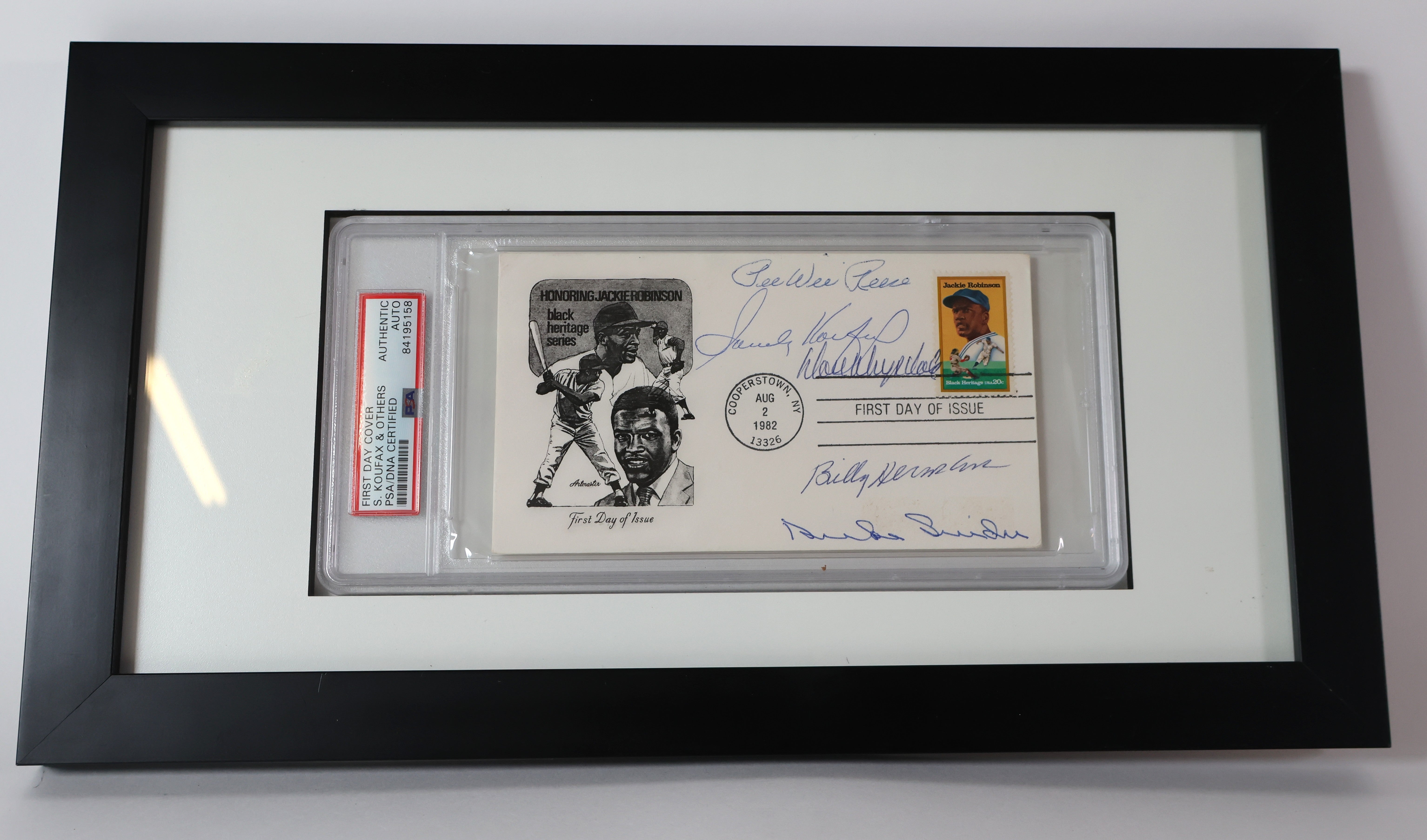 Own an incredibly rare piece of baseball history with this Jackie Robinson First Day Cover cachet signed by five Brooklyn Dodgers Hall of Famers: Sandy Koufax, Duke Snider, Billy Herman, Pee Wee Reese, and Don Drysdale. This museum-quality collectible honors the man who broke baseball's color barrier and changed America forever.