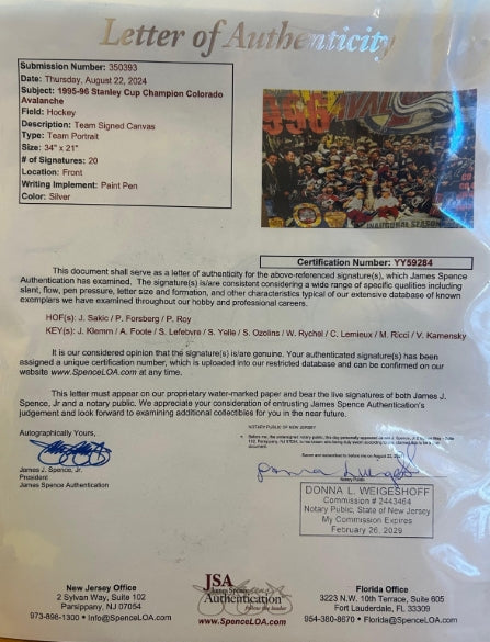 Celebrate one of hockey's most dominant championship runs with this extraordinary 38"x26" canvas photo collage commemorating the Colorado Avalanche's legendary 1996 Stanley Cup victory. This museum-quality piece features authentic signatures from the team's greatest players and is personally signed by renowned sports artist Stephen Holland.