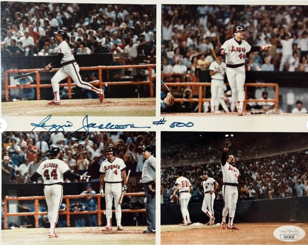 Own a piece of baseball history with this stunning Reggie Jackson autographed 8x10 photo commemorating his legendary 500th career home run. This premium collectible features Mr. October himself in his California Angels uniform, personally signed and inscribed with "#500" to mark this historic milestone achieved on September 17, 1984.