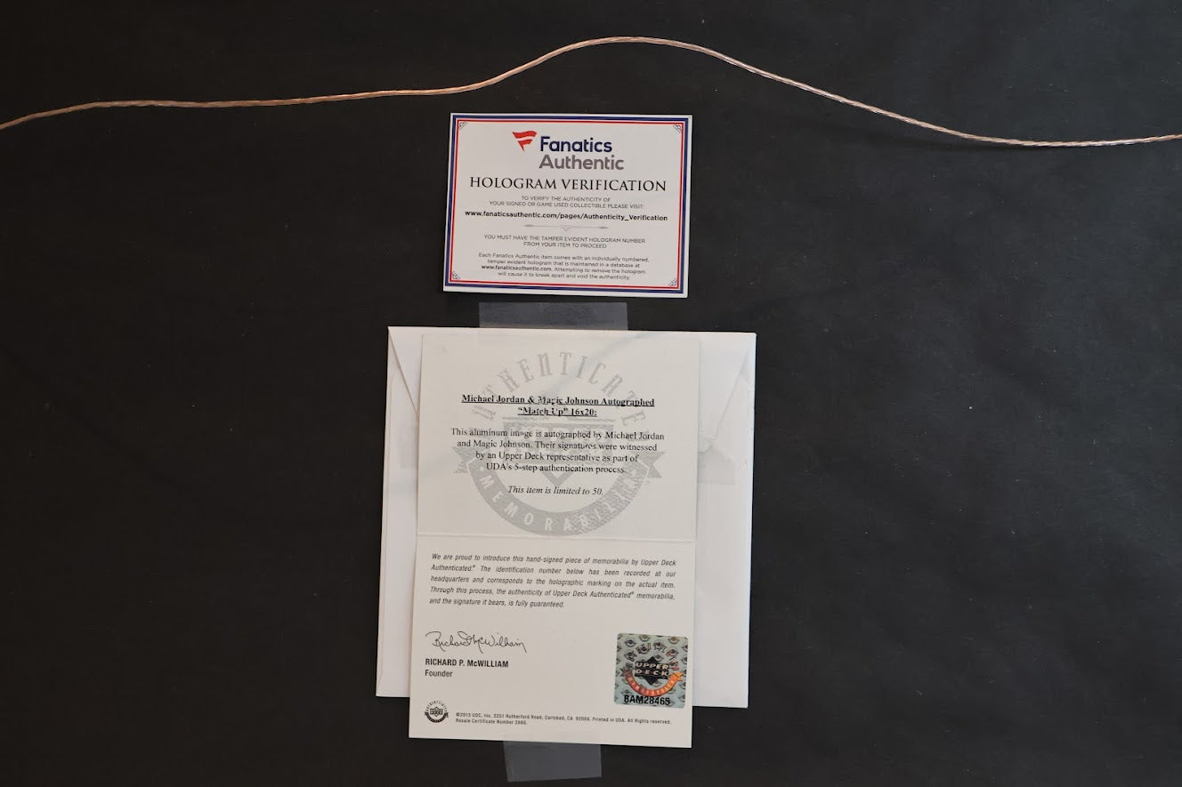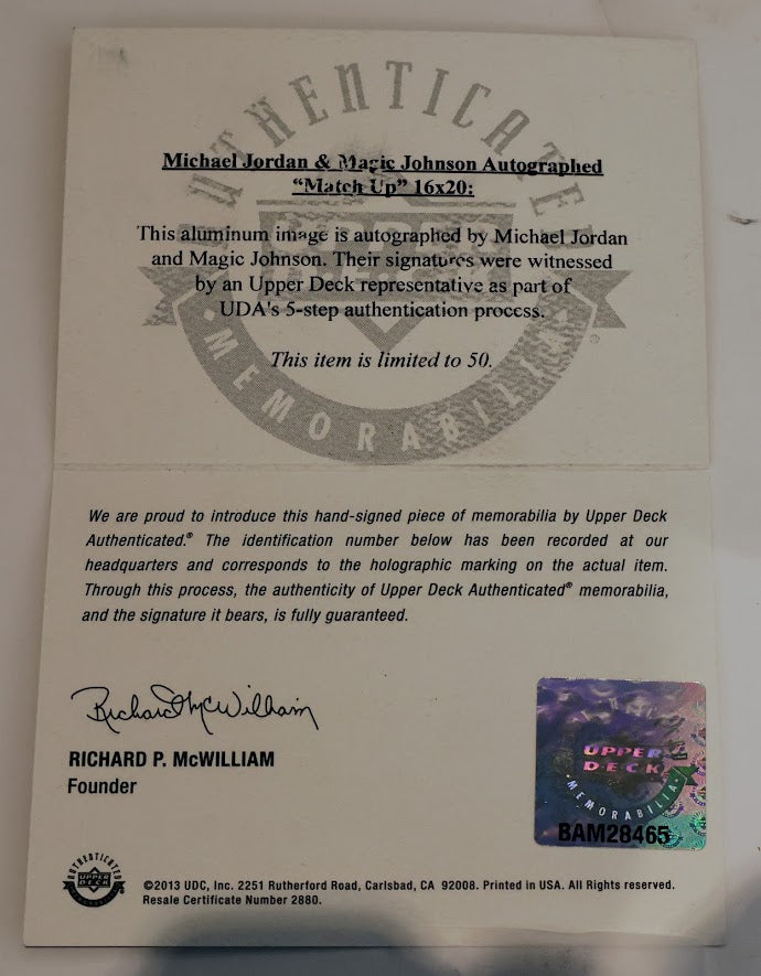 Magic Johnson and Michael Jordan are not just basketball legends; they are cultural icons who have left an indelible mark on the sport. This dual autographed "Match Up" photo captures the essence of their rivalry and mutual respect, making it a must-have for any basketball fan or collector.