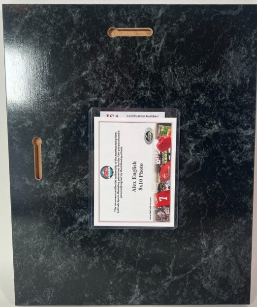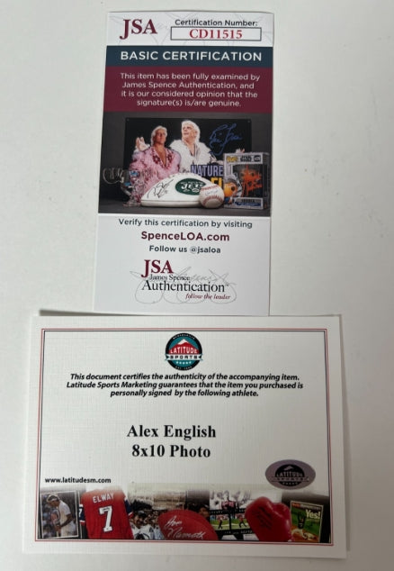 • Hand-signed by Alex English with "HOF 97" inscription