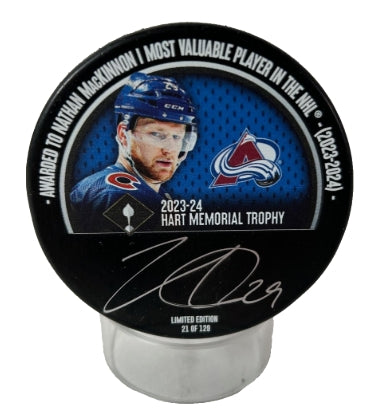 Nathan MacKinnon Autographed 2023-24 Hart Trophy Photo Puck LE-129 Fanatics COA