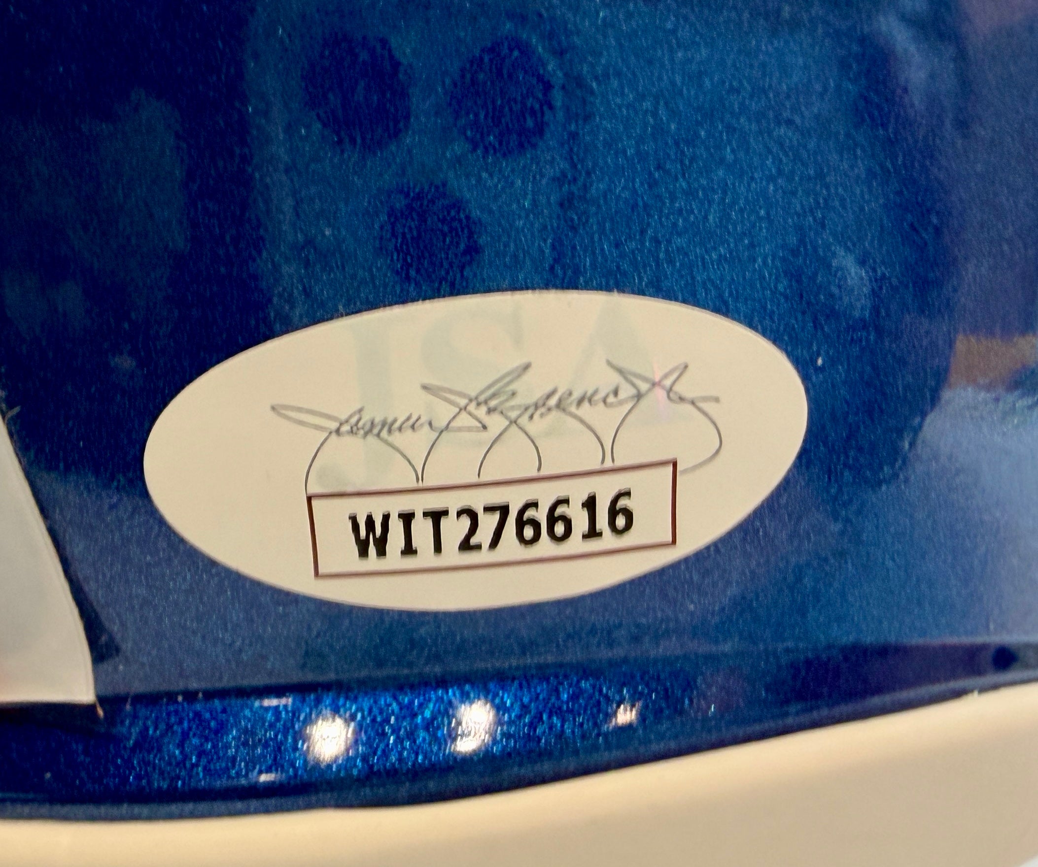 - Authentic Dennis Smith signature on blue metallic orange mask mini helmet