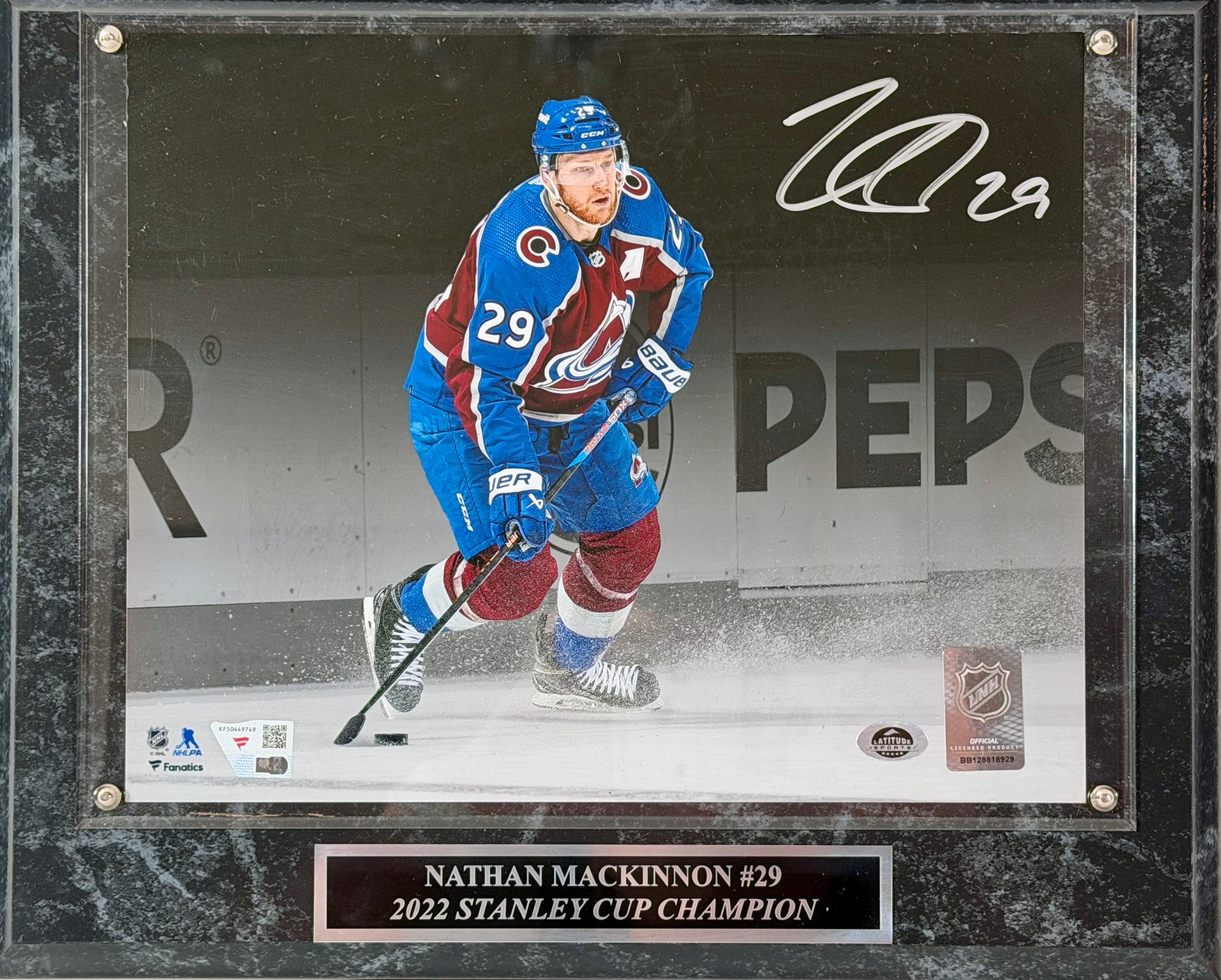 This premium Nathan MacKinnon autographed 8x10 photo comes beautifully mounted on a commemorative plaque, featuring the signature of one of the NHL's most electrifying players. Certified by Fanatics Authentic with an included Certificate of Authenticity, this display-ready piece celebrates the Colorado Avalanche captain and 2022 Stanley Cup champion.