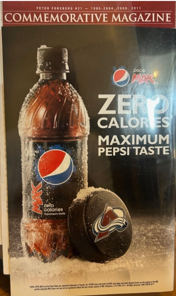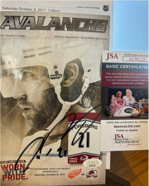 Own a piece of Colorado Avalanche history with this official program from Peter Forsberg's jersey retirement ceremony, held on October 8, 2011, at the Pepsi Center in Denver, Colorado. This is the night the Avalanche organization immortalized #21, raising Forsberg's jersey to the rafters in front of a sold-out crowd of passionate fans.