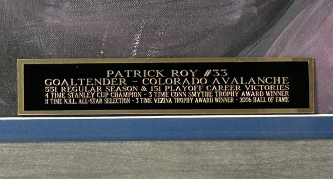- Career stats nameplate – Elegant nameplate featuring Patrick Roy's remarkable career achievements